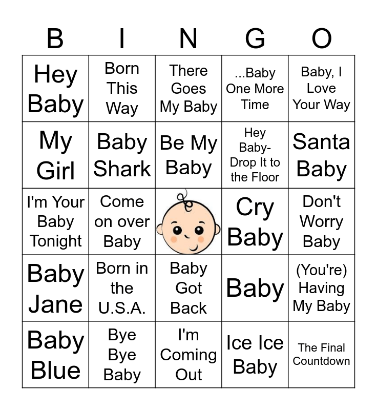 This bingo card has a free space and 50 words: Hot In Herre, The Final Countdown, Push It, I'm Coming Out, Born in the U.S.A., Get the Party Started, Born This Way, Sweet Child O' Mine, My Girl, She Will Be Loved, Baby Shark, ...Baby One More Time, (You're) Having My Baby, Baby, I Got You Babe, You're No Good, Be My Baby, Cry Baby, That's Just My Baby Doge, Baby, I Love Your Way, Come on over Baby, Ice Ice Baby, Hey Baby, Hey Baby-Drop It to the Floor, Hey! Baby, Beach Baby, Santa Baby, Runaway Baby, There Goes My Baby, Baby Got Back, Baby Love, Baby, Baby, Baby, What a Big Surprise, The Baby in the Bath, Bye Bye Baby, Somebody's Baby, Rock Your Baby, Baby, It's Cold Outside, Ooh Baby Baby, Don't Worry Baby, Can't Get Enough Of You Baby, Baby Hold On, Drive My Car, Baby Come Back, Baby Blue, I'm Your Baby Tonight, Can't Get Enough Of Your Love, Babe, Babydoll, Baby Jane and Everything She Wants.