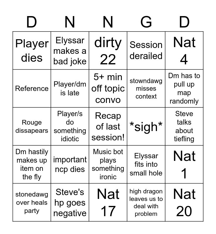 This bingo card has a free space and 24 words: important ncp dies, Steve's hp goes negative, 5+ min off topic convo, stonedawg over heals party, Nat 4, Player dies, Reference, Elyssar makes a bad joke, *sigh*, Music bot plays something ironic, stowndawg misses context, Rouge dissapears, Elyssar fits into small hole, Nat 1, Player/dm is late, high dragon leaves us to deal with problem, Steve talks about tiefling, dirty 22, Dm has to pull up map randomly, Player/s do something idiotic, Nat 20, Dm hastily makes up item on the fly, Session derailed and Nat 17.