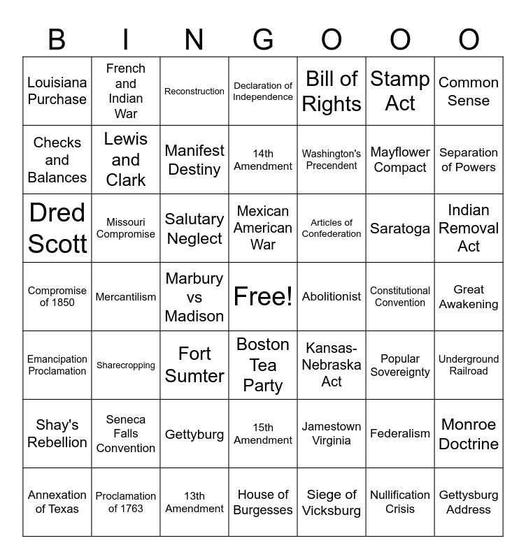 This bingo card has a free space and 48 words: Jamestown Virginia, Mayflower Compact, House of Burgesses, Mercantilism, Salutary Neglect, Great Awakening, French and Indian War, Proclamation of 1763, Stamp Act, Boston Tea Party, Common Sense, Declaration of Independence, Saratoga, Articles of Confederation, Shay's Rebellion, Constitutional Convention, Checks and Balances, Separation of Powers, Federalism, Bill of Rights, Washington's Precendent, Marbury vs Madison, Louisiana Purchase, Lewis and Clark, Monroe Doctrine, Manifest Destiny, Indian Removal Act, Annexation of Texas, Mexican American War, Missouri Compromise, Nullification Crisis, Abolitionist, Underground Railroad, Seneca Falls Convention, Compromise of 1850, Kansas- Nebraska Act, Popular Sovereignty, Dred Scott, Fort Sumter, Gettyburg, Emancipation Proclamation, Gettysburg Address, Reconstruction, 13th Amendment, 14th Amendment, 15th Amendment, Sharecropping and Siege of Vicksburg.