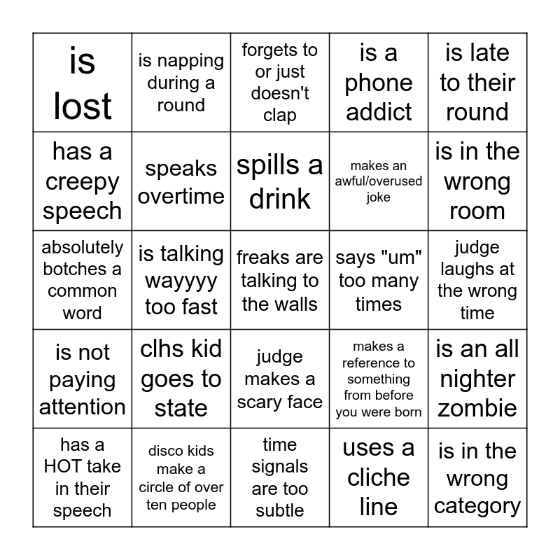This bingo card has a free space and 24 words: clhs kid goes to state, disco kids make a circle of over ten people, spills a drink, has a HOT take in their speech, is late to their round, is lost, has a creepy speech, is napping during a round, says "um" too many times, judge makes a scary face, makes an awful/overused joke, absolutely botches a common word, makes a reference to something from before you were born, is an all nighter zombie, speaks overtime, uses a cliche line, judge laughs at the wrong time, forgets to or just doesn't clap, is in the wrong room, is talking wayyyy too fast, is in the wrong category, is not paying attention, is a phone addict and time signals are too subtle.
