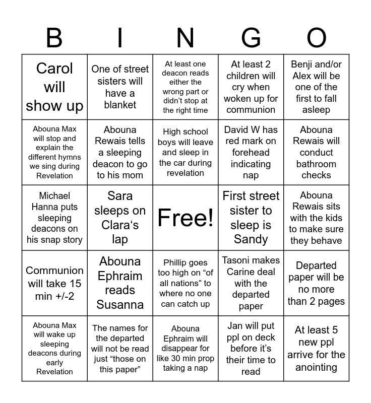 This bingo card has a free space and 24 words: Abouna Ephraim reads Susanna, The names for the departed will not be read just “those on this paper”, High school boys will leave and sleep in the car during revelation, Abouna Max will wake up sleeping deacons during early Revelation, Benji and/or Alex will be one of the first to fall asleep, Carol will show up, Abouna Max will stop and explain the different hymns we sing during Revelation, One of street sisters will have a blanket, First street sister to sleep is Sandy, Phillip goes too high on “of all nations” to where no one can catch up, David W has red mark on forehead indicating nap, Michael Hanna puts sleeping deacons on his snap story, Tasoni makes Carine deal with the departed paper, Departed paper will be no more than 2 pages, Abouna Rewais tells a sleeping deacon to go to his mom, Jan will put ppl on deck before it’s their time to read, Abouna Rewais sits with the kids to make sure they behave, At least one deacon reads either the wrong part or didn’t stop at the right time, Abouna Rewais will conduct bathroom checks, Sara sleeps on Clara‘s lap, At least 5 new ppl arrive for the anointing, Communion will take 15 min +/-2, At least 2 children will cry when woken up for communion and Abouna Ephraim will disappear for like 30 min prop taking a nap.
