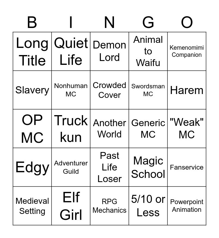 This bingo card has a free space and 24 words: Adventurer Guild, Elf Girl, Crowded Cover, Medieval Setting, Kemenomimi Companion, Long Title, Slavery, Quiet Life, Generic MC, Past Life Loser, Swordsman MC, OP MC, Magic School, Fanservice, Nonhuman MC, 5/10 or Less, "Weak" MC, Demon Lord, Harem, Truck kun, Powerpoint Animation, Edgy, Animal to Waifu and RPG Mechanics.