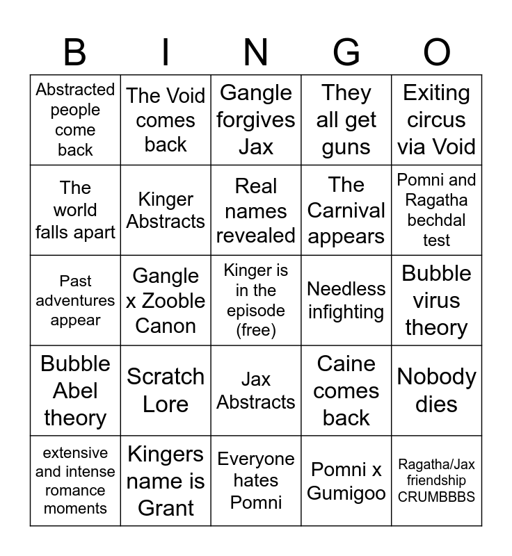 This bingo card has a free space and 31 words: Everyone hates Pomni, Abstraction is escape, Gangle x Zooble Canon, Kaufmo/Jax/Ribbit get friend lore, Abstracted people come back, Gangle forgives Jax, Kinger Abstracts, Caine comes back, Needless infighting, Pomni x Gumigoo, Bubble virus theory, Ragatha/Jax friendship CRUMBBBS, They're all copies [Hollow refrence], they pass the bechdal test, Pomni and Ragatha bechdal test, Everyone dies, Nobody dies, Scratch Lore, Bubble Abel theory, Jax Abstracts, Exiting circus via Void, NOTHING GETS EXPLAINED, extensive and intense romance moments, The Void comes back, The Carnival appears, The world falls apart, They all get guns, Past adventures appear, Kingers name is Grant, Real names revealed and Circus made for terminal illness.