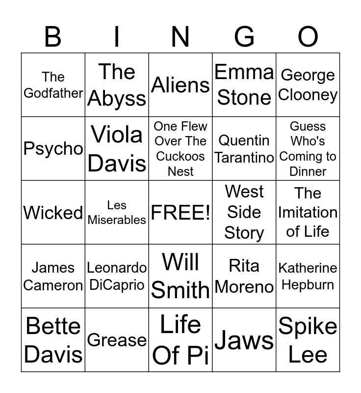This bingo card has a free space and 24 words: Leonardo DiCaprio, Grease, One Flew Over The Cuckoos Nest, Bette Davis, George Clooney, The Godfather, Psycho, The Abyss, West Side Story, Will Smith, Quentin Tarantino, Wicked, Rita Moreno, Katherine Hepburn, Viola Davis, Jaws, The Imitation of Life, Aliens, Guess Who's Coming to Dinner, Les Miserables, Spike Lee, James Cameron, Emma Stone and Life Of Pi.