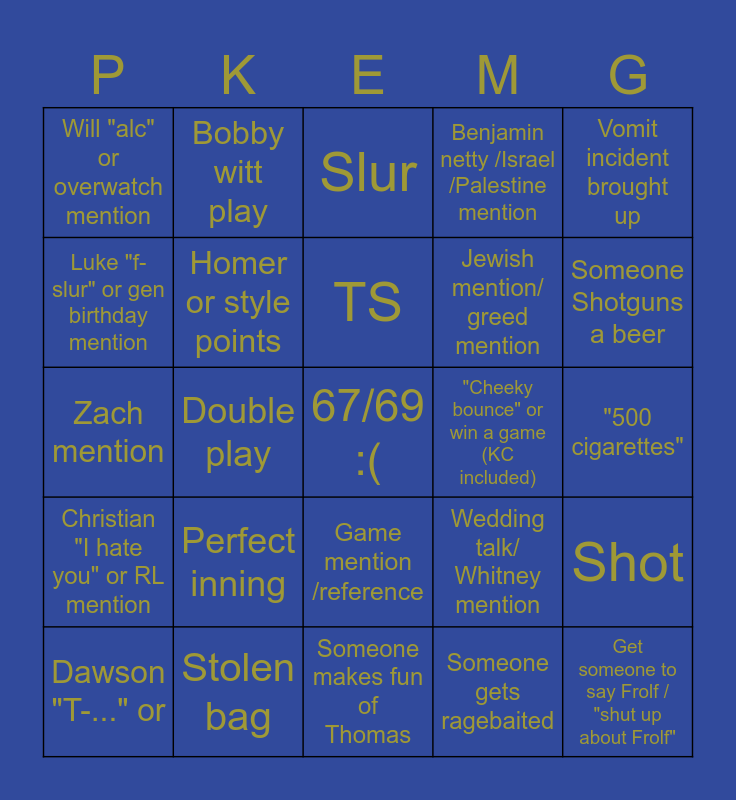 This bingo card has 25 words: Christian "I hate you" or RL mention, Stolen bag, 67/69 :(, Someone gets ragebaited, Vomit incident brought up, Will "alc" or overwatch mention, Bobby witt play, Slur, "Cheeky bounce" or win a game (KC included), Shot, Luke "f-slur" or gen birthday mention, Homer or style points, Someone makes fun of Thomas, Wedding talk/ Whitney mention, Someone Shotguns a beer, Dawson "T-..." or, Double play, TS, Jewish mention/ greed mention, "500 cigarettes", Zach mention, Perfect inning, Game mention /reference, Benjamin netty /Israel /Palestine mention and Get someone to say Frolf / "shut up about Frolf".