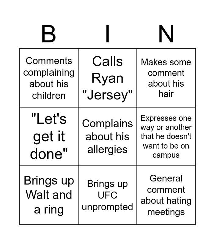 This bingo card has 9 words: Brings up Walt and a ring, Makes some comment about his hair, Calls Ryan "Jersey", "Let's get it done", Comments complaining about his children, Expresses one way or another that he doesn't want to be on campus, Complains about his allergies, General comment about hating meetings and Brings up UFC unprompted.