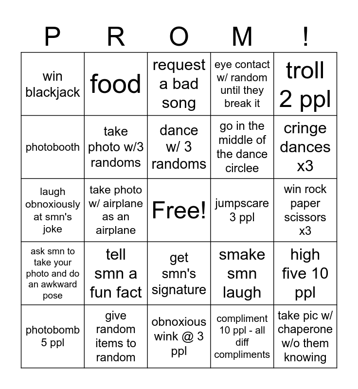 This bingo card has a free space and 24 words: tell smn a fun fact, give random items to random, dance w/ 3 randoms, photobomb 5 ppl, troll 2 ppl, win blackjack, photobooth, food, jumpscare 3 ppl, get smn's signature, go in the middle of the dance circlee, laugh obnoxiously at smn's joke, smake smn laugh, high five 10 ppl, take photo w/3 randoms, compliment 10 ppl - all diff compliments, win rock paper scissors x3, request a bad song, cringe dances x3, take photo w/ airplane as an airplane, take pic w/ chaperone w/o them knowing, ask smn to take your photo and do an awkward pose, eye contact w/ random until they break it and obnoxious wink @ 3 ppl.