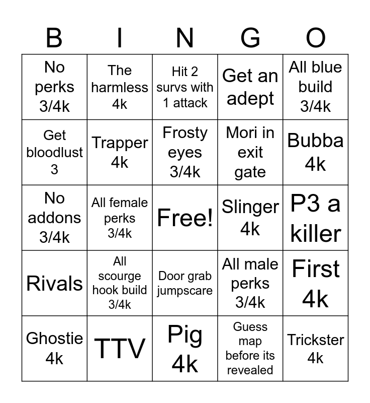 This bingo card has a free space and 79 words: 4k5/4, 12hook game, Hit 2 survs with 1 attack, 2tap down, Exposed down, All hex-build 3/4k, Grab a survivor off an interaction, Close hatch, Mori 2 survivors, Pride flag on survivor, Hook basement, 3/4k using double iri addons, Get an adept, No perks 3/4k, sub 1min down, Get bloodlust 3, 3/4k random loadout, All scourge hook build 3/4k, 4 slugged, P3 a killer, All green build 3/4k, All blue build 3/4k, No addons 3/4k, Frosty eyes 3/4k, Trapper 4k, Wraith 4k, Billy 4k, Nurse 4k, Hag 4k, Doctor 4k, Bubba 4k, Huntress 4k, Pig 4k, Clown 4k, Ghostie 4k, Slinger 4k, Executioner 4k, Blight 4k, Twins 4k, Trickster 4k, Nemesis 4k, Artist 4k, Wesker 4k, Knight 4k, Xeno 4k, The harmless 4k, Lich 4k, Dark Lord 4k, Ghoul 4k, Springtrap 4k, First 4k, All female perks 3/4k, All male perks 3/4k, All nonbinary/misc perks 3/4k, Freddy's pizza, Eerie of crows, four hooks within 7 minutes as wesker, 4 gen eruption proc, M2 only 3/4k, Door grab jumpscare, Mori in exit gate, Bedham, Garden of Joy, Only aura perks 3/4k, Only regression perks 3/4k, Only anti-heal perks 3/4k, Homefield advantage, No gen kicking 3/4k, ALWAYS gen kick 3/4k, Rivals, TTV, 3 for 3 on terror radius, Win dbd guess who, No audio 3/4k, Moonwalk only 2/3k, Guess map before its revealed, Mori 3 survivors, Complete a quest and Only crouched 2/3k (pig, ghostie).