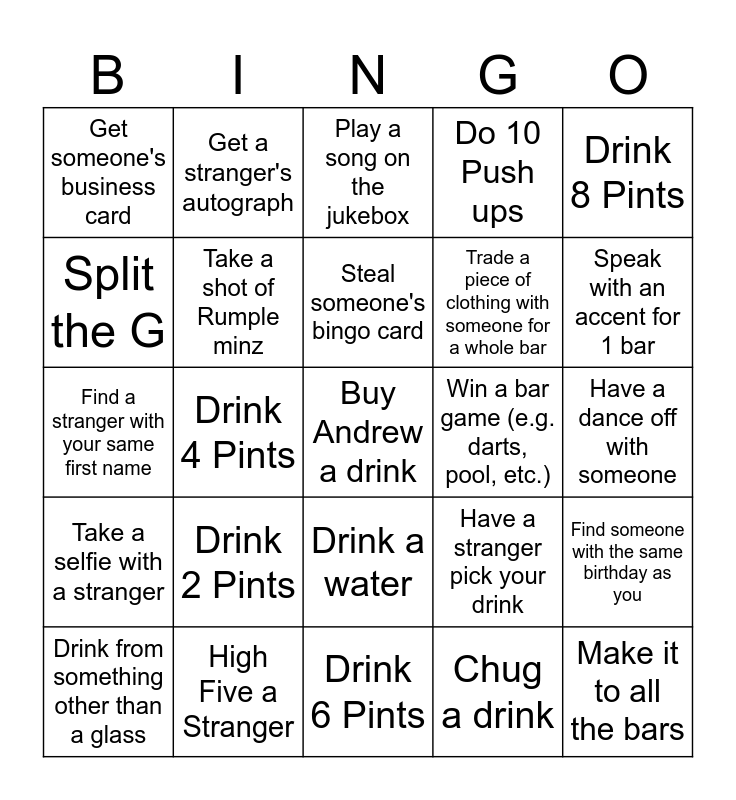 This bingo card has a free space and 24 words: Drink 2 Pints, High Five a Stranger, Steal someone's bingo card, Drink from something other than a glass, Drink 8 Pints, Get someone's business card, Split the G, Get a stranger's autograph, Win a bar game (e.g. darts, pool, etc.), Drink a water, Trade a piece of clothing with someone for a whole bar, Find a stranger with your same first name, Have a stranger pick your drink, Find someone with the same birthday as you, Take a shot of Rumple minz, Chug a drink, Have a dance off with someone, Play a song on the jukebox, Speak with an accent for 1 bar, Drink 4 Pints, Make it to all the bars, Take a selfie with a stranger, Do 10 Push ups and Drink 6 Pints.