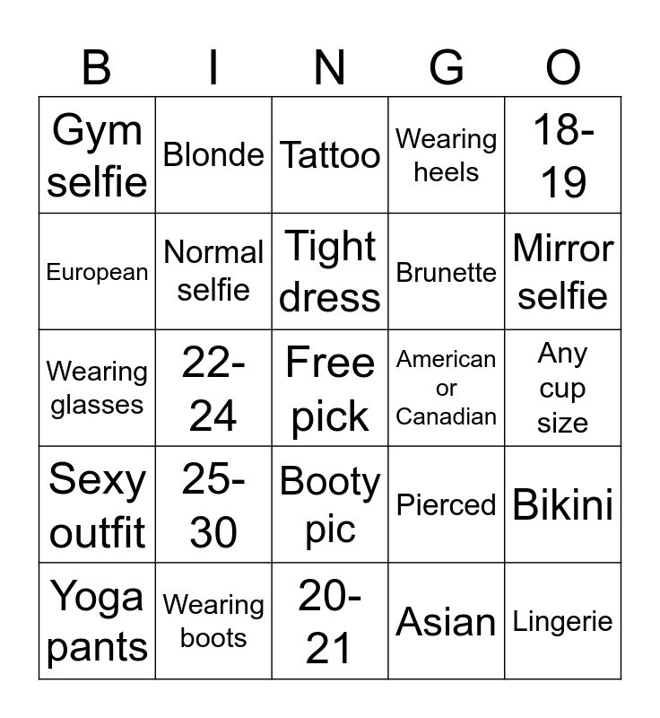 This bingo card has a free space and 24 words: 25-30, Wearing boots, Tight dress, Yoga pants, 18-19, Gym selfie, European, Blonde, American or Canadian, Booty pic, Brunette, Wearing glasses, Pierced, Bikini, Normal selfie, Asian, Any cup size, Tattoo, Mirror selfie, 22-24, Lingerie, Sexy outfit, Wearing heels and 20-21.