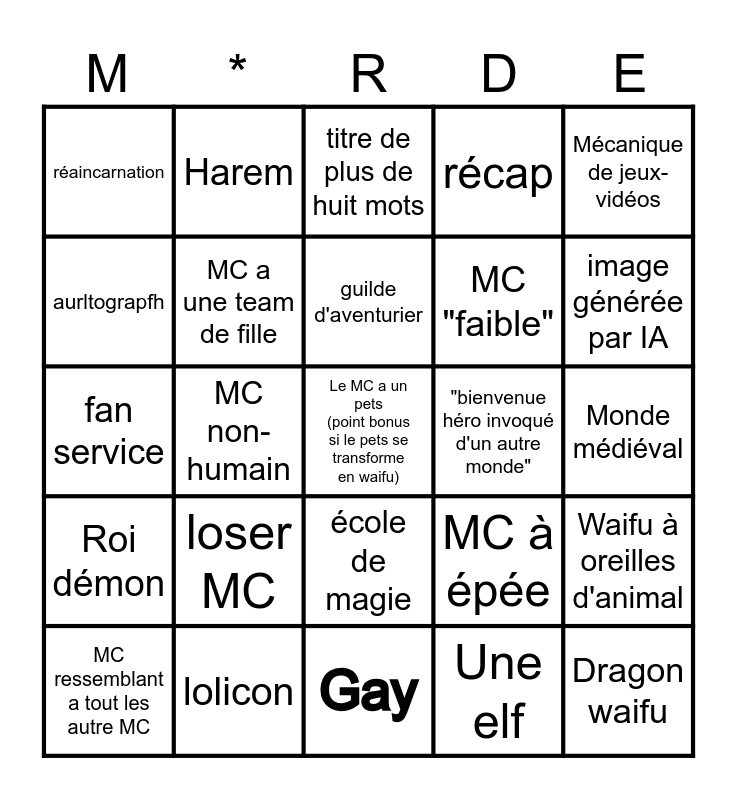This bingo card has a free space and 24 words: loser MC, lolicon, guilde d'aventurier, MC ressemblant a tout les autre MC, Mécanique de jeux-vidéos, réaincarnation, aurltograpfh, Harem, "bienvenue héro invoqué d'un autre monde", école de magie, MC "faible", fan service, MC à épée, Waifu à oreilles d'animal, MC a une team de fille, Une elf, Monde médiéval, titre de plus de huit mots, image générée par IA, MC non-humain, Dragon waifu, Roi démon, récap and Gay.