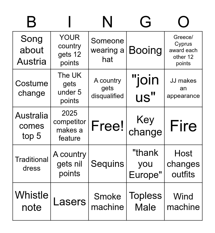 This bingo card has a free space and 37 words: The host sings, Someone says thank you europe, Singer winks at the camera, The UK gets under 5 points, Host changes outfits, A country gets nil points, A country gets disqualified, Israel ends top 5, Greece/ Cyprus award each other 12 points, Dramatic solo ballad, 2025 competitor makes a feature, Booing, Wind machine, Fire, Costume change, Traditional dress, Animal costume, Someone wearing a hat, Sequins, Key change, Song about Austria, JJ makes an appearance, Whistle note, Smoke machine, Rapping, Topless Male, YOUR country gets 12 points, Full white costume, Host makes a bad joke, Close up of a fan with a flag, Love song, Lasers, Australia comes top 5, Pun, "thank you Europe", "join us" and "make some noise".