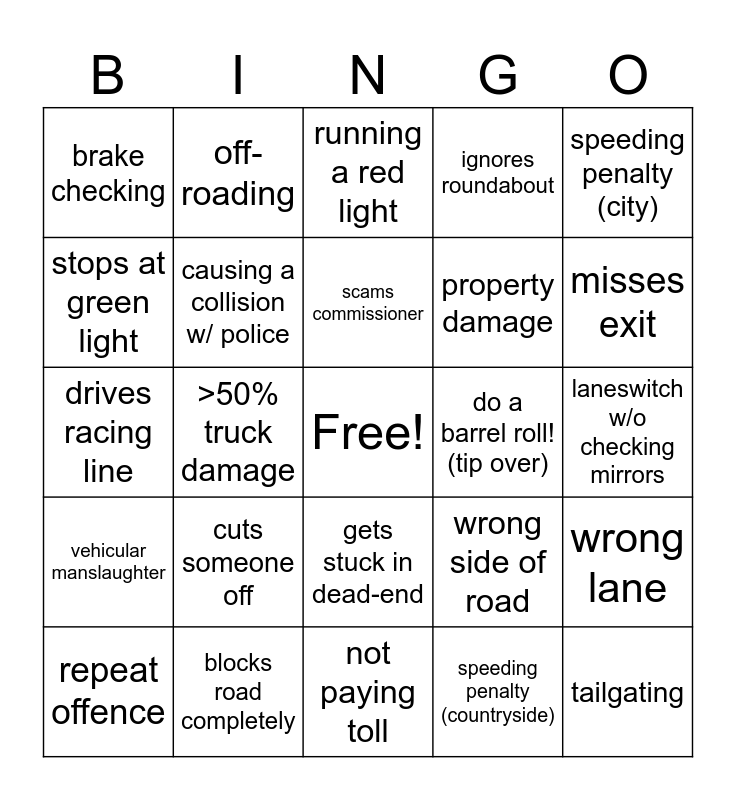 This bingo card has a free space and 31 words: not paying toll, miss delivery deadline, >50% truck damage, DUI (drinks water), brake checking, running a red light, causing a collision w/ police, wrong side of road, do a barrel roll! (tip over), speeding penalty (countryside), laneswitch w/o checking mirrors, tailgating, causing a collision, sleeping while driving, misses exit, illegal overtake, wrong lane, cuts someone off, vehicular manslaughter, gets stuck in dead-end, speeding penalty (city), runs out of fuel, repeat offence, off-roading, property damage, stops at green light, ignores roundabout, drives racing line, blocks road completely, scams commissioner and reverses on a highway.