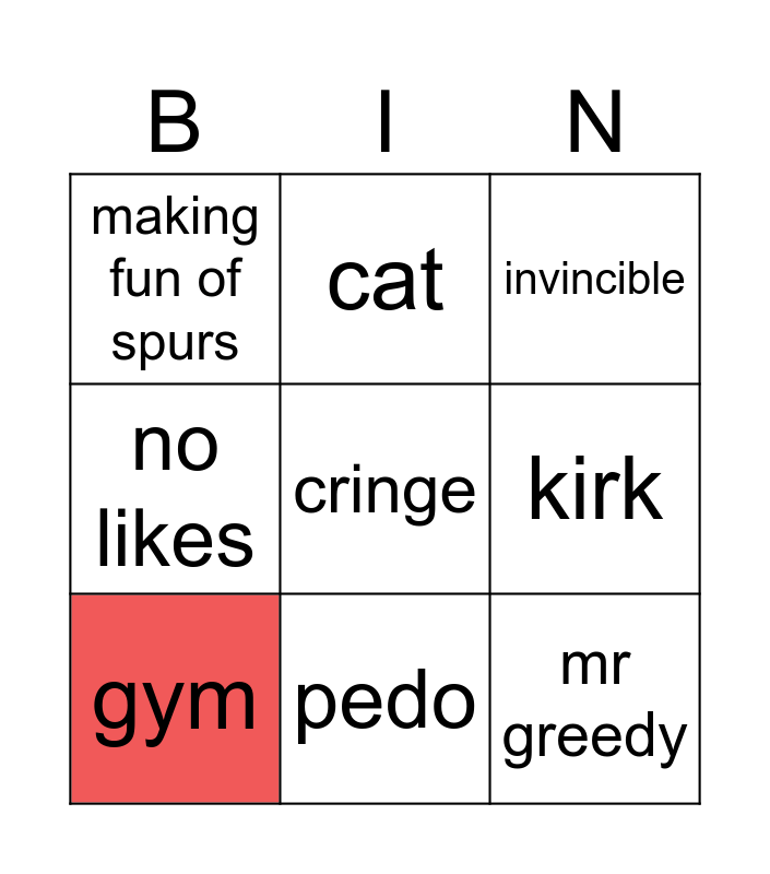This bingo card has a free space and 8 words: kirk, invincible, cat, gym, making fun of spurs, mr greedy, no likes and pedo.