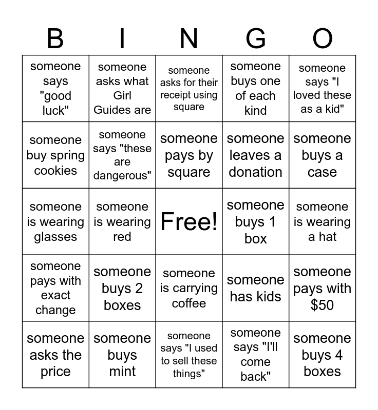 This bingo card has a free space and 24 words: someone buys 2 boxes, someone buys mint, someone pays by square, someone asks the price, someone says "I loved these as a kid", someone says "good luck", someone buy spring cookies, someone asks what Girl Guides are, someone buys 1 box, someone is carrying coffee, someone leaves a donation, someone is wearing glasses, someone has kids, someone pays with $50, someone says "these are dangerous", someone says "I'll come back", someone is wearing a hat, someone asks for their receipt using square, someone buys a case, someone is wearing red, someone buys 4 boxes, someone pays with exact change, someone buys one of each kind and someone says "I used to sell these things".