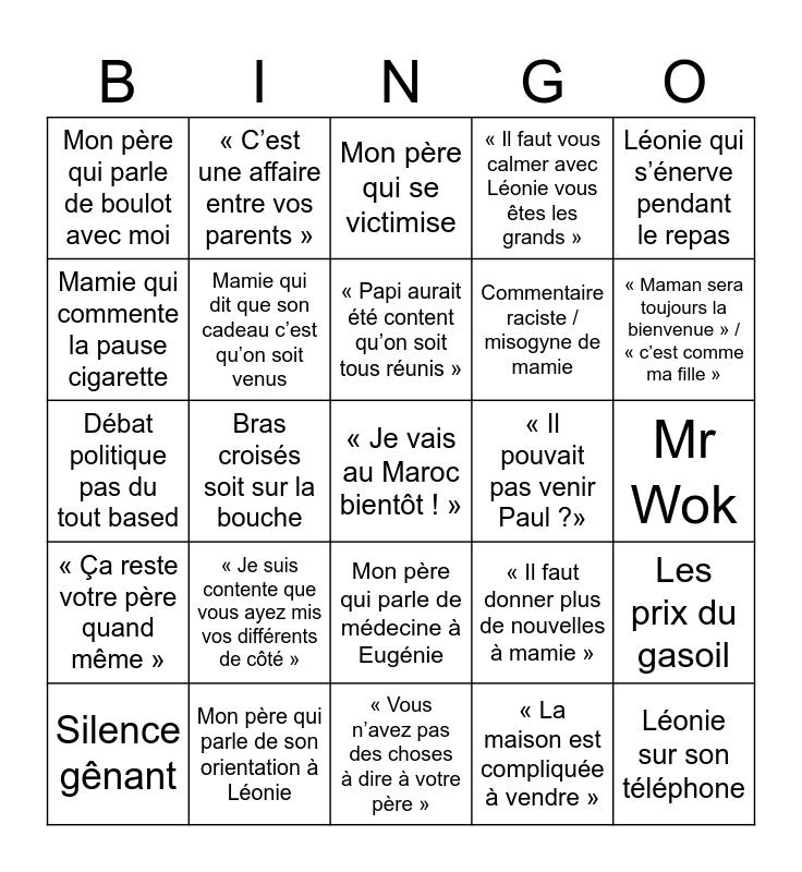 This bingo card has 25 words: « Je suis contente que vous ayez mis vos différents de côté », « Vous n’avez pas des choses à dire à votre père », « Papi aurait été content qu’on soit tous réunis », Silence gênant, Léonie qui s’énerve pendant le repas, Mon père qui parle de boulot avec moi, Mamie qui commente la pause cigarette, « C’est une affaire entre vos parents », « Il pouvait pas venir Paul ?», Mon père qui parle de médecine à Eugénie, Commentaire raciste / misogyne de mamie, Débat politique pas du tout based, « Il faut donner plus de nouvelles à mamie », Les prix du gasoil, Mamie qui dit que son cadeau c’est qu’on soit venus, Léonie sur son téléphone, Mr Wok, Mon père qui se victimise, « Maman sera toujours la bienvenue » / « c’est comme ma fille », Bras croisés soit sur la bouche, « Je vais au Maroc bientôt ! », Mon père qui parle de son orientation à Léonie, « Ça reste votre père quand même », « Il faut vous calmer avec Léonie vous êtes les grands » and « La maison est compliquée à vendre ».