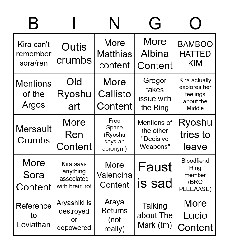 This bingo card has a free space and 24 words: Kira says anything associated with brain rot, Aryashiki is destroyed or depowered, More Callisto Content, Reference to Leviathan, BAMBOO HATTED KIM, Kira can't remember sora/ren, Mentions of the Argos, Outis crumbs, Mentions of the other "Decisive Weapons", More Valencina Content, Gregor takes issue with the Ring, Mersault Crumbs, Faust is sad, Bloodfiend Ring member (BRO PLEEAASE), Old Ryoshu art, Talking about The Mark (tm), Ryoshu tries to leave, More Matthias content, Kira actually explores her feelings about the Middle, More Ren Content, More Lucio Content, More Sora Content, More Albina Content and Araya Returns (not really).