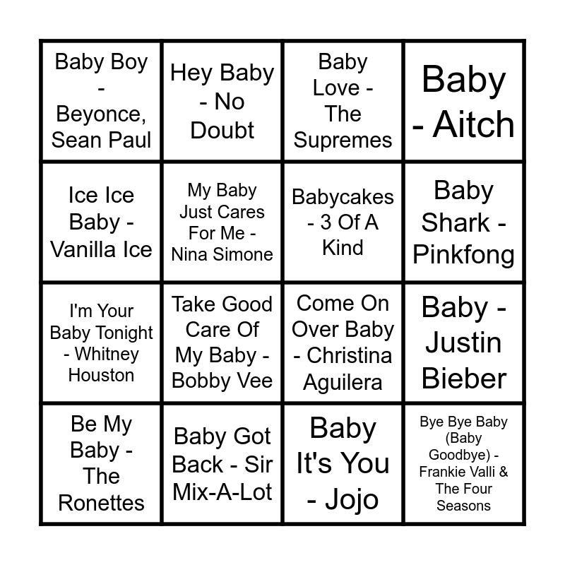 This bingo card has 20 words: Baby - Justin Bieber, Baby one more time - Britney Spears, Baby Love - The Supremes, Hey Baby (Uhh,Ahh) - DJ Otzi, Be My Baby - The Ronettes, Ice Ice Baby - Vanilla Ice, Baby Got Back - Sir Mix-A-Lot, Baby Boy - Beyonce, Sean Paul, I'm Your Baby Tonight - Whitney Houston, Hey Baby - No Doubt, Take Good Care Of My Baby - Bobby Vee, Come On Over Baby - Christina Aguilera, My Baby Just Cares For Me - Nina Simone, Bye Bye Baby (Baby Goodbye) - Frankie Valli & The Four Seasons, Babycakes - 3 Of A Kind, Don't Call Me Baby - Maddison Avenue, Baby Shark - Pinkfong, Baby - Aitch, Baby It's You - Jojo and Baby Don't Hurt Me - Anne Marie & David Guetta.