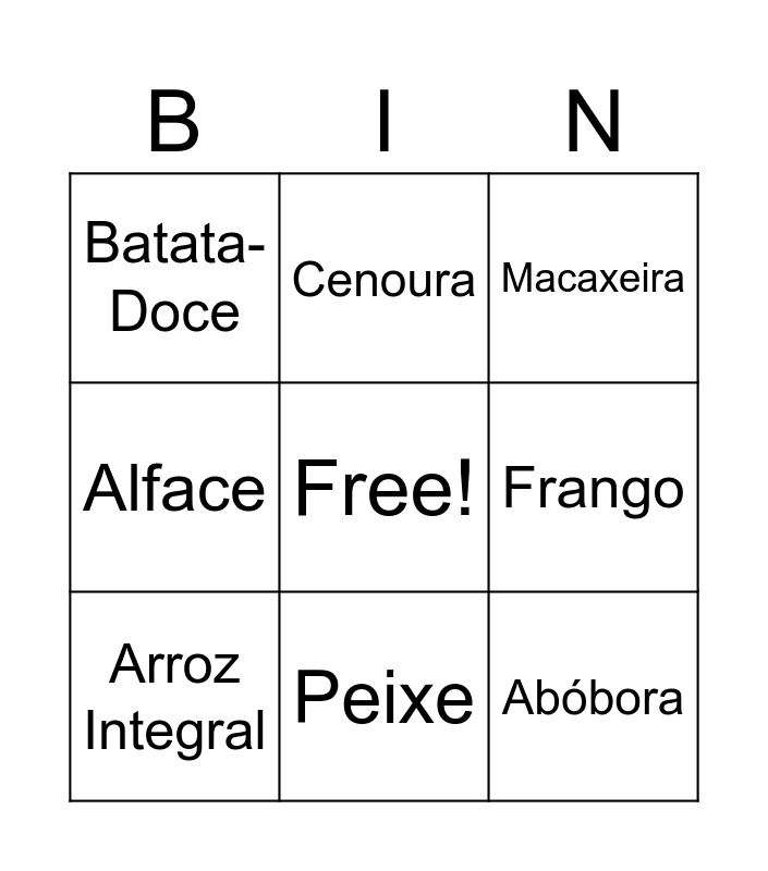 This bingo card has a free space and 20 words: Arroz Integral, Feijão Preto, Macaxeira, Banana, Ovo Caipira, Abóbora, Lentilha, Cenoura, Aveia, Batata-Doce, Melancia, Caju, Alface, Tomate, Milho Verde, Leite desnatado, Peixe, Frango, Mamão and Manga.