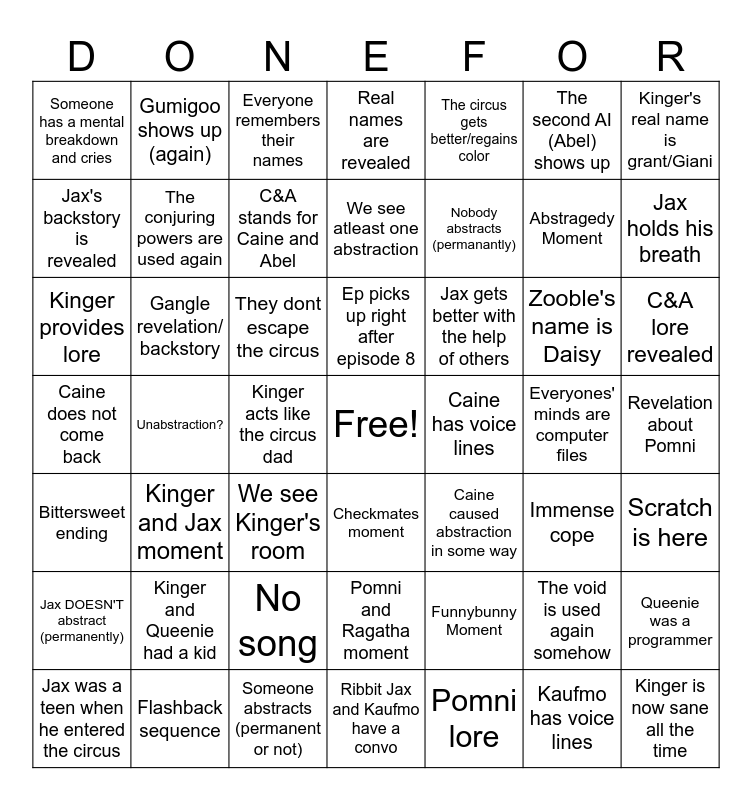 This bingo card has a free space and 48 words: Funnybunny Moment, Abstragedy Moment, Ribbit Jax and Kaufmo have a convo, Unabstraction?, They dont escape the circus, Revelation about Pomni, Gumigoo shows up (again), Flashback sequence, The second AI (Abel) shows up, Checkmates moment, Kinger's real name is grant/Giani, Real names are revealed, Zooble's name is Daisy, Jax gets better with the help of others, Jax DOESN'T abstract (permanently), Everyones' minds are computer files, Jax's backstory is revealed, Jax holds his breath, The void is used again somehow, The circus gets better/regains color, Nobody abstracts (permanantly), Kinger acts like the circus dad, Someone has a mental breakdown and cries, The conjuring powers are used again, Queenie was a programmer, C&A stands for Caine and Abel, C&A lore revealed, Jax was a teen when he entered the circus, Ep picks up right after episode 8, Gangle revelation/ backstory, Kaufmo has voice lines, Caine has voice lines, Scratch is here, Kinger and Queenie had a kid, Caine does not come back, Caine caused abstraction in some way, Immense cope, Kinger provides lore, We see Kinger's room, No song, Bittersweet ending, Kinger is now sane all the time, Everyone remembers their names, Someone abstracts (permanent or not), We see atleast one abstraction, Pomni and Ragatha moment, Kinger and Jax moment and Pomni lore.