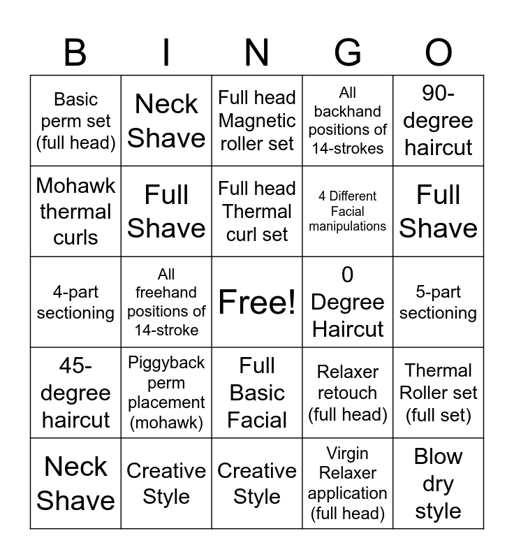 This bingo card has a free space and 24 words: Piggyback perm placement (mohawk), Creative Style, Full head Thermal curl set, Neck Shave, 90-degree haircut, Basic perm set (full head), Mohawk thermal curls, Neck Shave, 0 Degree Haircut, Full Basic Facial, 4 Different Facial manipulations, 4-part sectioning, Relaxer retouch (full head), Thermal Roller set (full set), Full Shave, Virgin Relaxer application (full head), 5-part sectioning, Full head Magnetic roller set, Full Shave, All freehand positions of 14-stroke, Blow dry style, 45-degree haircut, All backhand positions of 14-strokes and Creative Style.