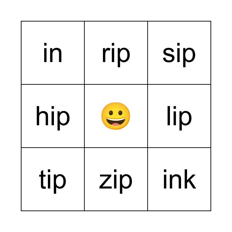 This bingo card has a free space and 8 words: lip, sip, rip, tip, in, ink, hip and zip.