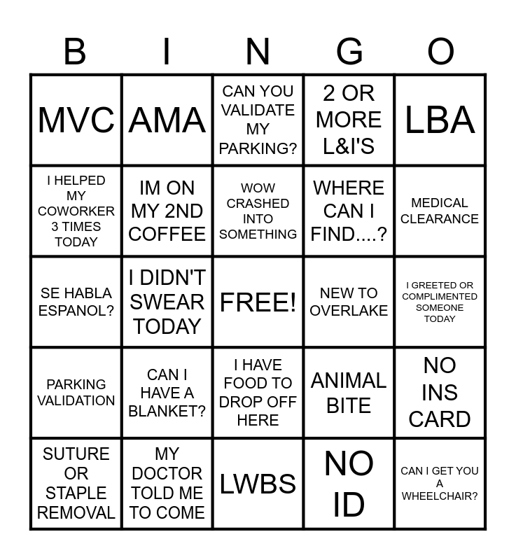 This bingo card has a free space and 24 words: CAN I HAVE A BLANKET?, MY DOCTOR TOLD ME TO COME, WOW CRASHED INTO SOMETHING, SUTURE OR STAPLE REMOVAL, LBA, MVC, I HELPED MY COWORKER 3 TIMES TODAY, AMA, NEW TO OVERLAKE, I HAVE FOOD TO DROP OFF HERE, WHERE CAN I FIND....?, SE HABLA ESPANOL?, ANIMAL BITE, NO INS CARD, IM ON MY 2ND COFFEE, NO ID, I GREETED OR COMPLIMENTED SOMEONE TODAY, CAN YOU VALIDATE MY PARKING?, MEDICAL CLEARANCE, I DIDN'T SWEAR TODAY, CAN I GET YOU A WHEELCHAIR?, PARKING VALIDATION, 2 OR MORE L&I'S and LWBS.