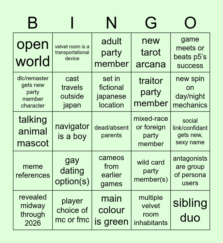 This bingo card has a free space and 24 words: gay dating option(s), player choice of mc or fmc, set in fictional japanese location, revealed midway through 2026, game meets or beats p5’s success, open world, dlc/remaster gets new party member character, velvet room is a transportational device, mixed-race or foreign party member, cameos from earlier games, traitor party member, talking animal mascot, wild card party member(s), antagonists are group of persona users, cast travels outside japan, multiple velvet room inhabitants, social link/confidant gets new, sexy name, adult party member, new spin on day/night mechanics, navigator is a boy, sibling duo, meme references, new tarot arcana and main colour is green.
