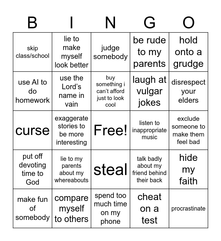 This bingo card has a free space and 28 words: hide my faith, join in on gossip, laugh at vulgar jokes, cheat on a test, use AI to do homework, judge somebody, lie to make myself look better, put off devoting time to God, listen to inappropriate music, make fun of somebody, curse, be rude to my parents, compare myself to others, spend too much time on my phone, disrespect your elders, watch something i’m not supposed to, lie to my parents about my whereabouts, use the Lord’s name in vain, buy something i can’t afford just to look cool, steal, skip class/school, act different at school vs at church, procrastinate, exaggerate stories to be more interesting, exclude someone to make them feel bad, talk badly about my friend behind their back, hold onto a grudge and speak out of anger.