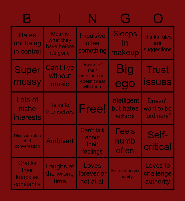 This bingo card has a free space and 25 words: Cracks their knuckles constantly, Ambivert, Aware of their emotions but doesn't deal with them, Romanticize toxicity, Trust issues, Hates not being in control, Mourns what they have before it's gone, Impulsive to feel something, Big ego, Self-critical, Lots of niche interests, Can't live without music, Feels numb often, Loves to challenge authority, Super messy, Laughs at the wrong time, Loves forever or not at all, Sleeps in makeup, Doesn't want to be "ordinary", Disassociates mid conversation, Talks to themselves, Can't talk about their feelings, Intelligent but hates school, Thinks rules are suggestions and Thinks rules are suggestions.