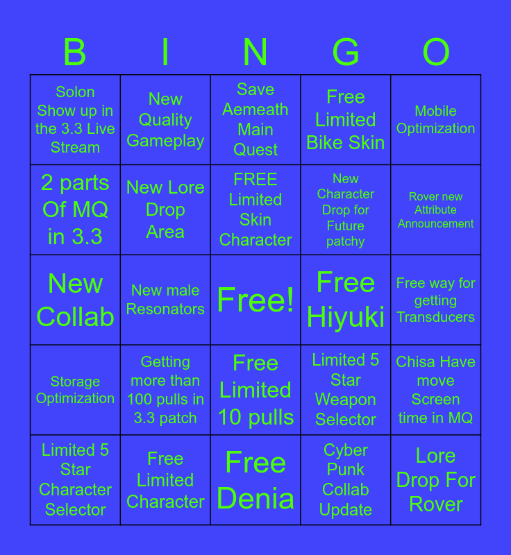 This bingo card has a free space and 24 words: Limited 5 Star Character Selector, Getting more than 100 pulls in 3.3 patch, FREE Limited Skin Character, Cyber Punk Collab Update, Mobile Optimization, Solon Show up in the 3.3 Live Stream, New Quality Gameplay, Save Aemeath Main Quest, Free Hiyuki, Free way for getting Transducers, New Collab, New Lore Drop Area, Limited 5 Star Weapon Selector, Chisa Have move Screen time in MQ, 2 parts Of MQ in 3.3, Free Limited Character, Free Denia, Free Limited Bike Skin, Rover new Attribute Announcement, Storage Optimization, New male Resonators, Free Limited 10 pulls, New Character Drop for Future patchy and Lore Drop For Rover.