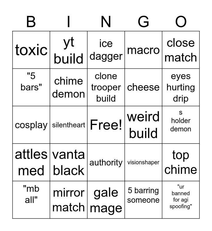 This bingo card has a free space and 24 words: vanta black, mirror match, clone trooper build, "mb all", close match, toxic, "5 bars", yt build, weird build, authority, cheese, cosplay, visionshaper, top chime, chime demon, 5 barring someone, s holder demon, ice dagger, eyes hurting drip, silentheart, "ur banned for agi spoofing", attles med, macro and gale mage.