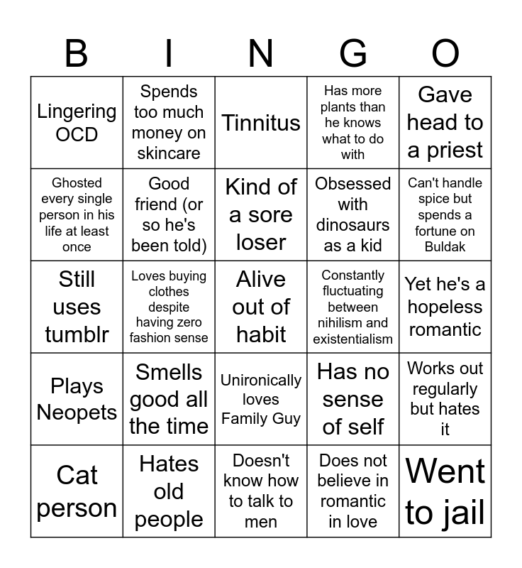 This bingo card has a free space and 24 words: Smells good all the time, Hates old people, Kind of a sore loser, Cat person, Gave head to a priest, Lingering OCD, Ghosted every single person in his life at least once, Spends too much money on skincare, Constantly fluctuating between nihilism and existentialism, Unironically loves Family Guy, Obsessed with dinosaurs as a kid, Still uses tumblr, Has no sense of self, Works out regularly but hates it, Good friend (or so he's been told), Does not believe in romantic in love, Yet he's a hopeless romantic, Tinnitus, Can't handle spice but spends a fortune on Buldak, Loves buying clothes despite having zero fashion sense, Went to jail, Plays Neopets, Has more plants than he knows what to do with and Doesn't know how to talk to men.