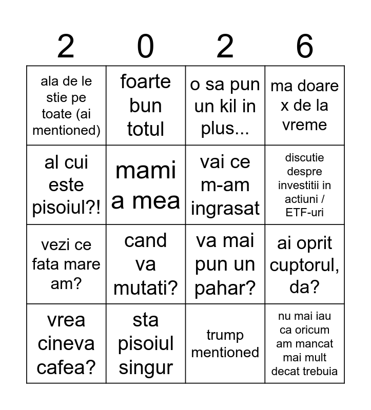 This bingo card has 34 words: Free!, iubita lui tati, catalin de la italic e un prost, din cauza pesedeului, nu mai iau ca oricum am mancat mai mult decat trebuia, vai ce m-am ingrasat, al cui este pisoiul?!, foarte bun cozonacul, foarte bun totul, a fost asa FUN in turcia!!, discutie despre investitii in actiuni / ETF-uri, o sa pun un kil in plus..., nu aveti nevoie de animal acasa, ma asteapta Tutu, sta pisoiul singur, cand va mutati?, cand aveti de gand sa va casatoriti?, va mai pun un pahar?, hai mami odata!!, t word mentioned, any war mentioned, am doua joburi, ala de le stie pe toate (ai mentioned), trump mentioned, mi-e somn, vrea cineva cafea?, ma doare x de la vreme, piticanie, vezi ce fata mare am?, mami a mea, hai sa mergem si noi acasa (mai stau o ora), ai oprit cuptorul, da?, sunt melomaniac(a) and fat shaming Yuki.