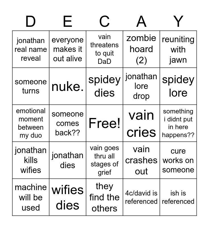 This bingo card has a free space and 24 words: jonathan dies, wifies dies, spidey dies, machine will be used, reuniting with jawn, jonathan real name reveal, someone turns, everyone makes it out alive, vain cries, vain goes thru all stages of grief, jonathan lore drop, emotional moment between my duo, vain crashes out, cure works on someone, nuke., 4c/david is referenced, something i didnt put in here happens??, vain threatens to quit DaD, spidey lore, someone comes back??, ish is referenced, jonathan kills wifies, zombie hoard (2) and they find the others.