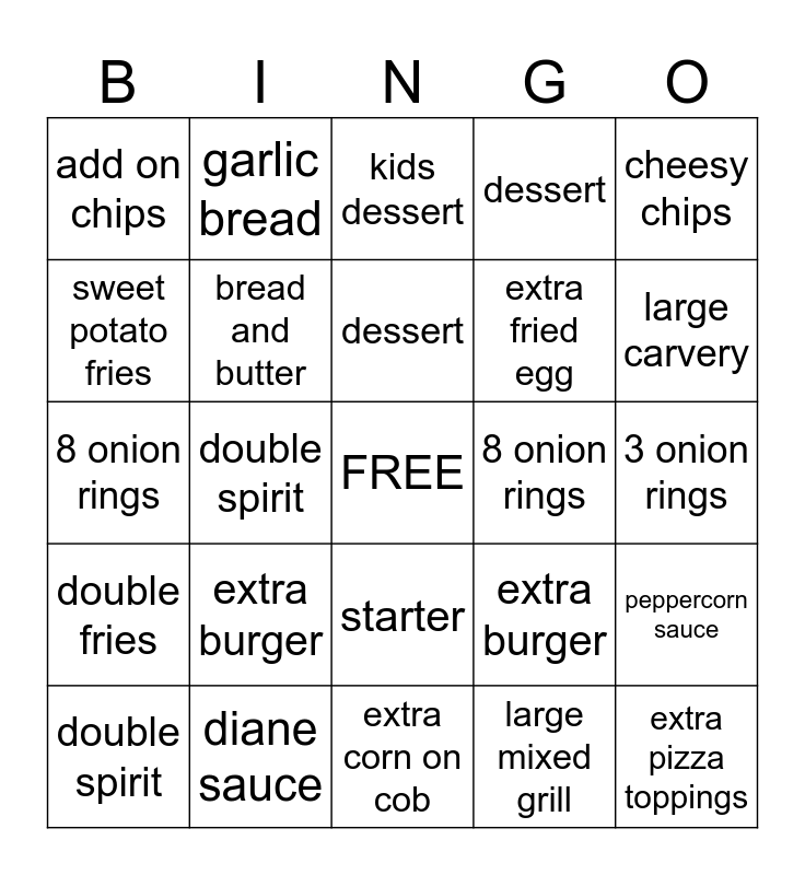 This bingo card has a free space and 24 words: extra burger, diane sauce, dessert, double spirit, cheesy chips, add on chips, sweet potato fries, garlic bread, 8 onion rings, starter, extra fried egg, 8 onion rings, extra burger, peppercorn sauce, bread and butter, large mixed grill, 3 onion rings, kids dessert, large carvery, double spirit, extra pizza toppings, double fries, dessert and extra corn on cob.