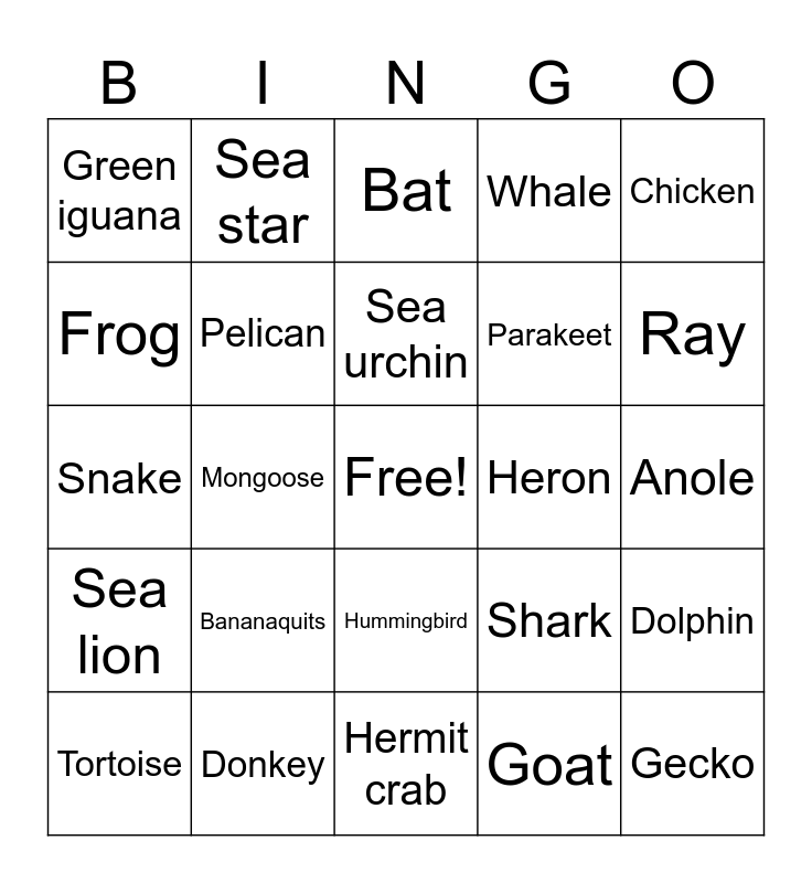 This bingo card has a free space and 30 words: Donkey, Deer, Mongoose, Wild pigs, Green iguana, Bat, Pelican, Hummingbird, Heron, Hermit crab, Anole, Gecko, Goat, Sea turtle, Ray, Jelly fish, Shark, Sea lion, Bananaquits, Chicken, Snake, Frigate bird, Sea star, Parakeet, Frog, Whale, Dolphin, Tortoise, Sea urchin and Squid.