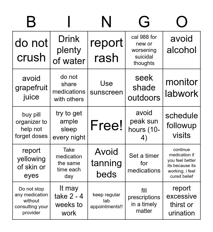 This bingo card has a free space and 24 words: Take medication the same time each day, It may take 2 - 4 weeks to work, Use sunscreen, Do not stop any medication without consulting your provider, avoid alcohol, do not crush, avoid grapefruit juice, Drink plenty of water, avoid peak sun hours (10-4), Avoid tanning beds, seek shade outdoors, buy pill organizer to help not forget doses, Set a timer for medications, continue medication if you feel better its because its working. i feel cured belief, do not share medications with others, fill prescriptions in a timely matter, schedule followup visits, report rash, monitor labwork, try to get ample sleep every night, report excessive thirst or urination, report yellowing of skin or eyes, cal 988 for new or worsening suicidal thoughts and keep regular lab appointments!!.