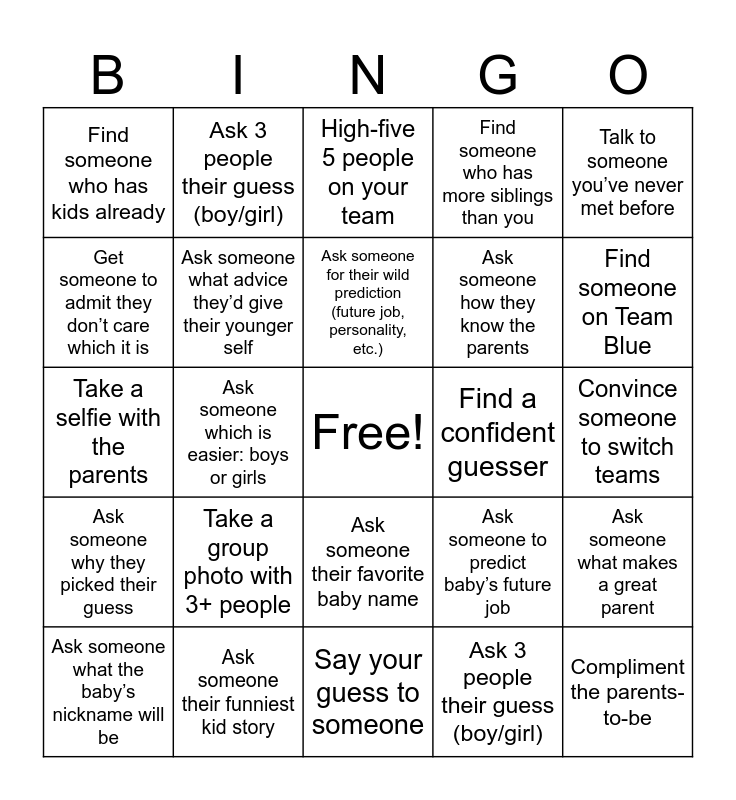 This bingo card has a free space and 24 words: Take a group photo with 3+ people, Ask someone their funniest kid story, Ask someone for their wild prediction (future job, personality, etc.), Ask someone what the baby’s nickname will be, Talk to someone you’ve never met before, Find someone who has kids already, Get someone to admit they don’t care which it is, Ask 3 people their guess (boy/girl), Find a confident guesser, Ask someone their favorite baby name, Ask someone how they know the parents, Take a selfie with the parents, Ask someone to predict baby’s future job, Ask someone what makes a great parent, Ask someone what advice they’d give their younger self, Ask 3 people their guess (boy/girl), Convince someone to switch teams, High-five 5 people on your team, Find someone on Team Blue, Ask someone which is easier: boys or girls, Compliment the parents-to-be, Ask someone why they picked their guess, Find someone who has more siblings than you and Say your guess to someone.