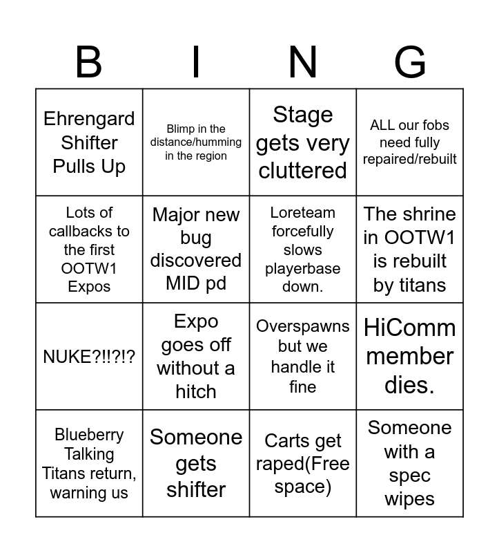 This bingo card has 16 words: Someone gets shifter, HiComm member dies., Stage gets very cluttered, Ehrengard Shifter Pulls Up, NUKE?!!?!?, Blimp in the distance/humming in the region, Overspawns but we handle it fine, Carts get raped(Free space), Lots of callbacks to the first OOTW1 Expos, Major new bug discovered MID pd, Blueberry Talking Titans return, warning us, ALL our fobs need fully repaired/rebuilt, Expo goes off without a hitch, The shrine in OOTW1 is rebuilt by titans, Loreteam forcefully slows playerbase down. and Someone with a spec wipes.