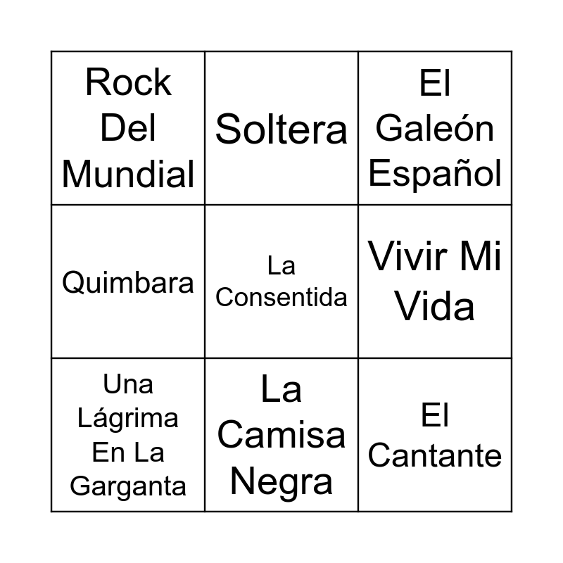 This bingo card has 31 words: Free!, La Vida Es Un Carnaval, Bésame Mucho, Gracias a la vida, Rock Del Mundial, La Consentida, El Galeón Español, Un Año Más, El Rey, Una Lágrima Y Un Recuerdo, Una Lágrima En La Garganta, La Joya Del Pacífico, Dos Gardenias, El Cuarto de Tula, Danza Kuduro, Me Porto Bonito, Y Nos Dieron las Diez, Por Una Cabeza, A Media Luz, La Muralla, A quién le importa, Yo Nunca Vi Televisión, DtMF, Soltera, Vivir Mi Vida, Quimbara, La Camisa Negra, El Cantante, Ojalá Que Llueva Café, Vivir Sin Aire and Amor Eterno.