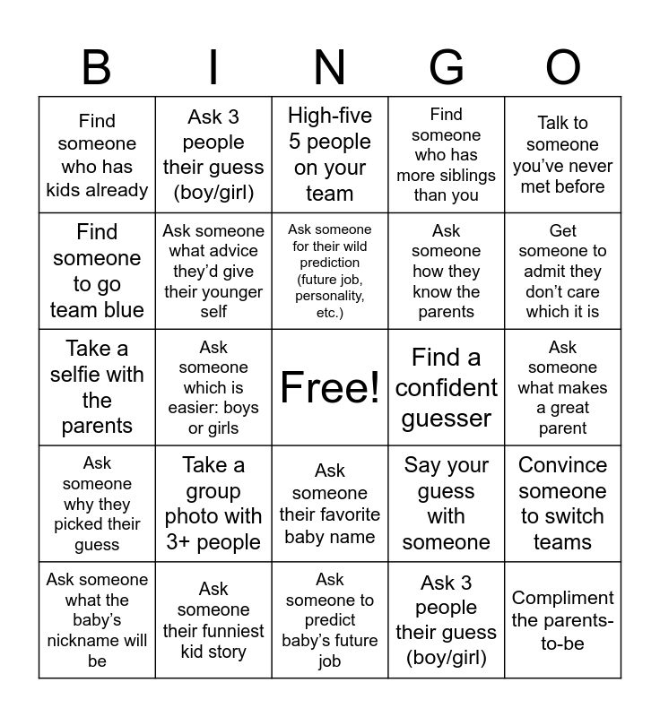 This bingo card has a free space and 24 words: Take a group photo with 3+ people, Ask someone their funniest kid story, Ask someone for their wild prediction (future job, personality, etc.), Ask someone what the baby’s nickname will be, Talk to someone you’ve never met before, Find someone who has kids already, Find someone to go team blue, Ask 3 people their guess (boy/girl), Find a confident guesser, Ask someone their favorite baby name, Ask someone how they know the parents, Take a selfie with the parents, Say your guess with someone, Convince someone to switch teams, Ask someone what advice they’d give their younger self, Ask 3 people their guess (boy/girl), Ask someone what makes a great parent, High-five 5 people on your team, Get someone to admit they don’t care which it is, Ask someone which is easier: boys or girls, Compliment the parents-to-be, Ask someone why they picked their guess, Find someone who has more siblings than you and Ask someone to predict baby’s future job.