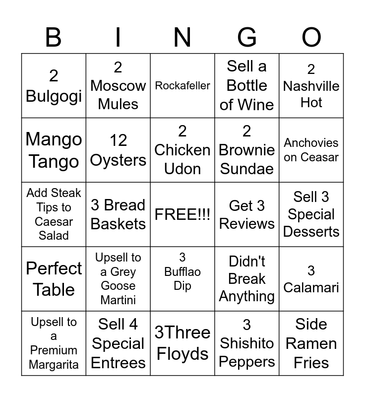 This bingo card has a free space and 24 words: Upsell to a Grey Goose Martini, Sell 4 Special Entrees, 2 Chicken Udon, Upsell to a Premium Margarita, 2 Nashville Hot, 2 Bulgogi, Mango Tango, 2 Moscow Mules, Get 3 Reviews, 3 Bufflao Dip, 2 Brownie Sundae, Add Steak Tips to Caesar Salad, Didn't Break Anything, 3 Calamari, 12 Oysters, 3 Shishito Peppers, Sell 3 Special Desserts, Rockafeller, Anchovies on Ceasar, 3 Bread Baskets, Side Ramen Fries, Perfect Table, Sell a Bottle of Wine and 3Three Floyds.