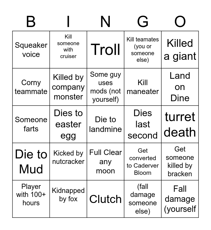 This bingo card has a free space and 24 words: Kicked by nutcracker, Kidnapped by fox, Some guy uses mods (not yourself), Player with 100+ hours, Killed a giant, Squeaker voice, Corny teammate, Kill someone with cruiser, Dies last second, Full Clear any moon, Kill maneater, Someone farts, Get converted to Caderver Bloom, Get someone killed by bracken, Killed by company monster, (fall damage someone else), turret death, Troll, Land on Dine, Dies to easter egg, Fall damage (yourself, Die to Mud, Kill teamates (you or someone else) and Clutch.