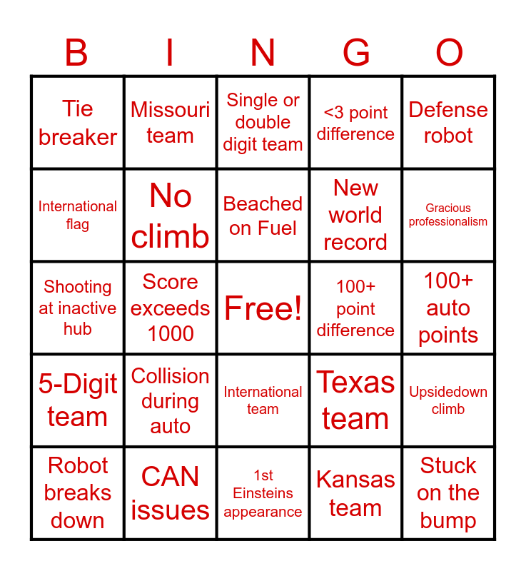This bingo card has a free space and 38 words: Triple Climb, Triple L3 Climb, Triple Auto Climb, No climb, Upsidedown climb, Collision during auto, Beached on Fuel, Robot tipped over, Defense robot, New world record, Score exceeds 1000, <3 point difference, Stuck on the bump, 100+ auto points, International flag, 5-Digit team, 3-Digit team, Single or double digit team, Technical difficulties, 100+ point difference, Tie breaker, CAN issues, Gracious professionalism, Robot breaks down, Fuel goes outside of the field, 1st Einsteins appearance, Back-to-back Einsteins, Previous game is mentioned, All girls drive team, Yellow card, Red card, International team, Kansas team, Missouri team, California team, Texas team, Shooting at inactive hub and Robot falls off the tower.