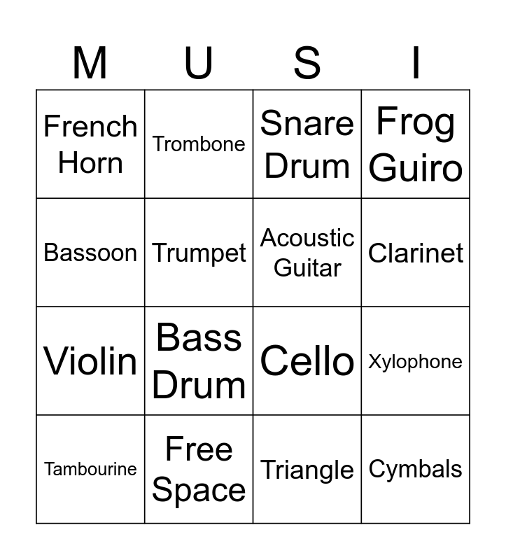 This bingo card has 25 words: Flute, Oboe, Clarinet, Saxophone, Bassoon, French Horn, Trumpet, Trombone, Free Space, Tuba, Violin, Cello, Harp, Electric Guitar, Acoustic Guitar, Banjo, Triangle, Snare Drum, Bass Drum, Xylophone, Tambourine, Boom whackers, Cymbals, Frog Guiro and Piano.