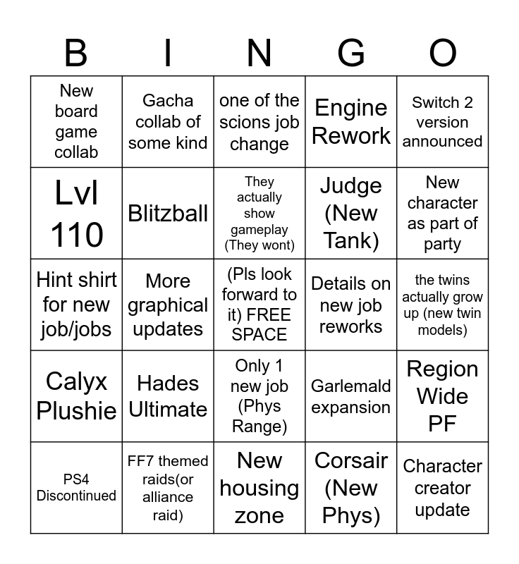 This bingo card has a free space and 24 words: Hades Ultimate, FF7 themed raids(or alliance raid), They actually show gameplay (They wont), PS4 Discontinued, Switch 2 version announced, New board game collab, Lvl 110, Gacha collab of some kind, Details on new job reworks, Only 1 new job (Phys Range), Judge (New Tank), Hint shirt for new job/jobs, Garlemald expansion, Region Wide PF, Blitzball, Corsair (New Phys), the twins actually grow up (new twin models), one of the scions job change, New character as part of party, More graphical updates, Character creator update, Calyx Plushie, Engine Rework and New housing zone.
