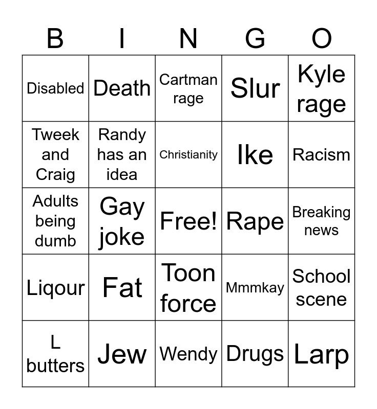 This bingo card has a free space and 24 words: Fat, Jew, Christianity, L butters, Kyle rage, Disabled, Tweek and Craig, Death, Rape, Toon force, Ike, Adults being dumb, Mmmkay, School scene, Randy has an idea, Drugs, Breaking news, Cartman rage, Racism, Gay joke, Larp, Liqour, Slur and Wendy.