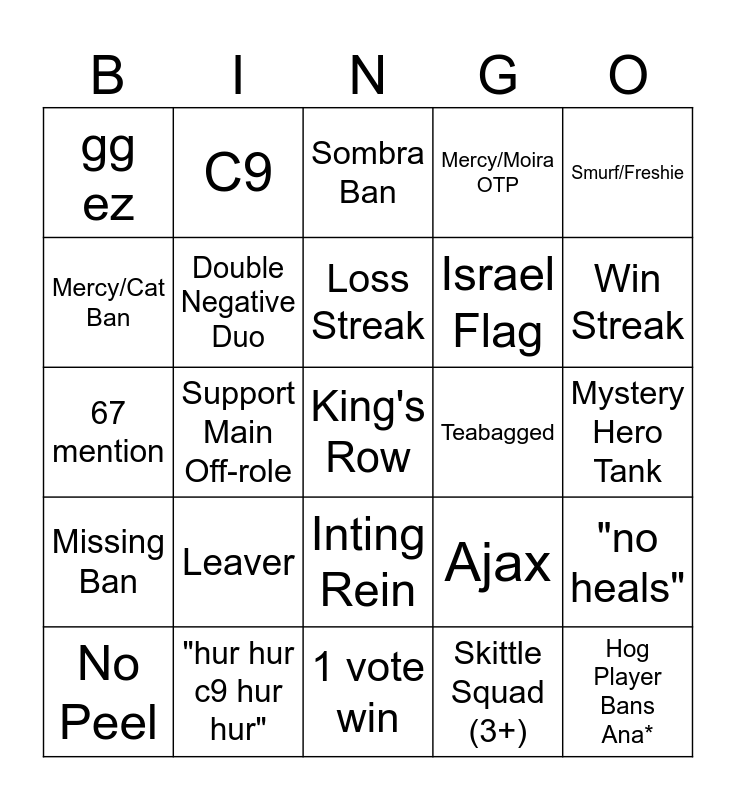 This bingo card has a free space and 24 words: Leaver, "hur hur c9 hur hur", Loss Streak, No Peel, Smurf/Freshie, gg ez, Mercy/Cat Ban, C9, Teabagged, Inting Rein, Israel Flag, 67 mention, Ajax, "no heals", Double Negative Duo, Skittle Squad (3+), Mystery Hero Tank, Sombra Ban, Win Streak, Support Main Off-role, Hog Player Bans Ana*, Missing Ban, Mercy/Moira OTP and 1 vote win.