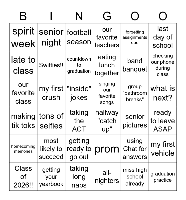 This bingo card has 36 words: prom, getting ready to go out, all-nighters, late to class, making tik toks, singing our favorite songs, Swifties!!, taking long naps, forgetting assignments due, using Chat for answers, checking our phone during class, our favorite teachers, my first vehicle, my first crush, eating lunch together, spirit week, homecoming memories, group "bathroom breaks", our favorite class, football season, "inside" jokes, tons of selfies, hallway "catch up", taking the ACT, senior pictures, senior night, band banquet, getting your yearbook, countdown to graduation, last day of school, graduation practice, Class of 2026!!, ready to leave ASAP, what is next?, most likely to succeed and miss high school already.